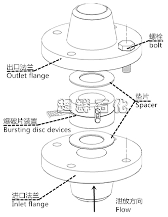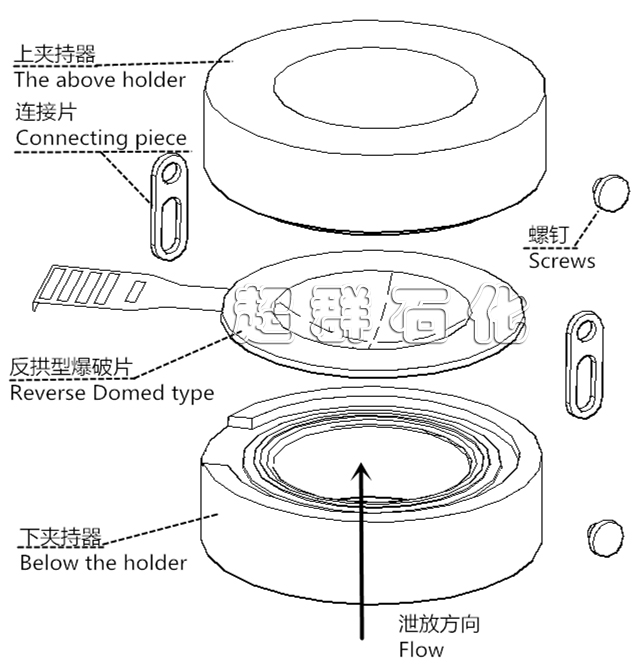 爆破片為單層膜片,凸面處于受壓側(cè),超壓時,爆破片 失穩(wěn)翻轉(zhuǎn),被上夾持器內(nèi)的刀架刺破,泄放壓力,保護(hù)容器 安全。