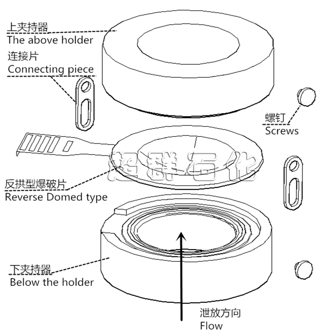 由反拱形金屬膜片和環(huán)形鱷齒構成的組合式爆破片,凹面接觸介質。爆破時,拱形膜片失穩(wěn)翻轉,被鍔齒沿周邊處剪開,泄放壓力。